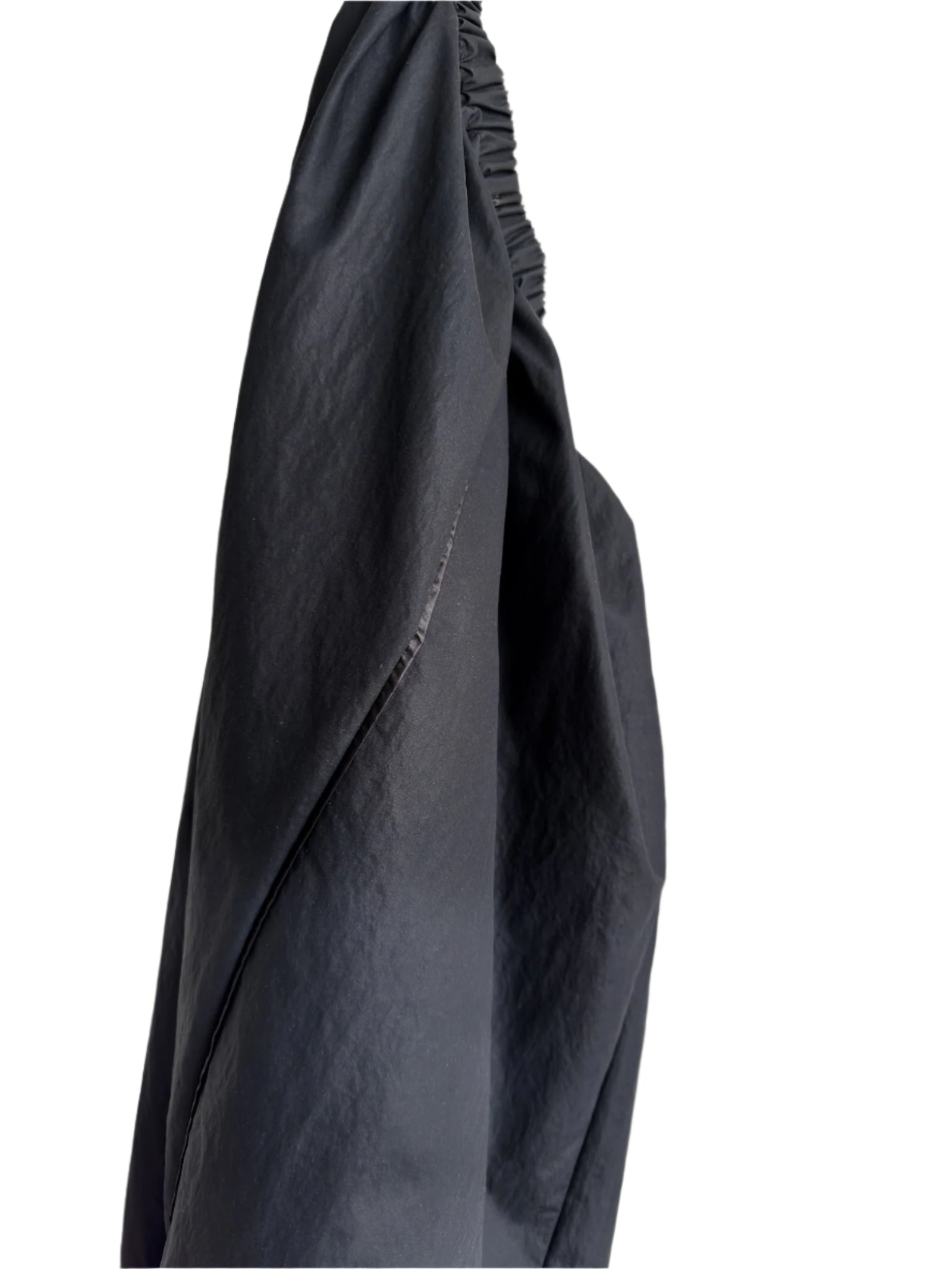 Cocoon skirt takes a conventional A-form skirt and adds a twist by using premium Japanese nylon as a material. It has a stripe in the middle, side pockets, and an elastic band. The skirt is midi length. The material of this skirt is thicker than that of the others A skirts in our collection, giving it a more sculptural feel.