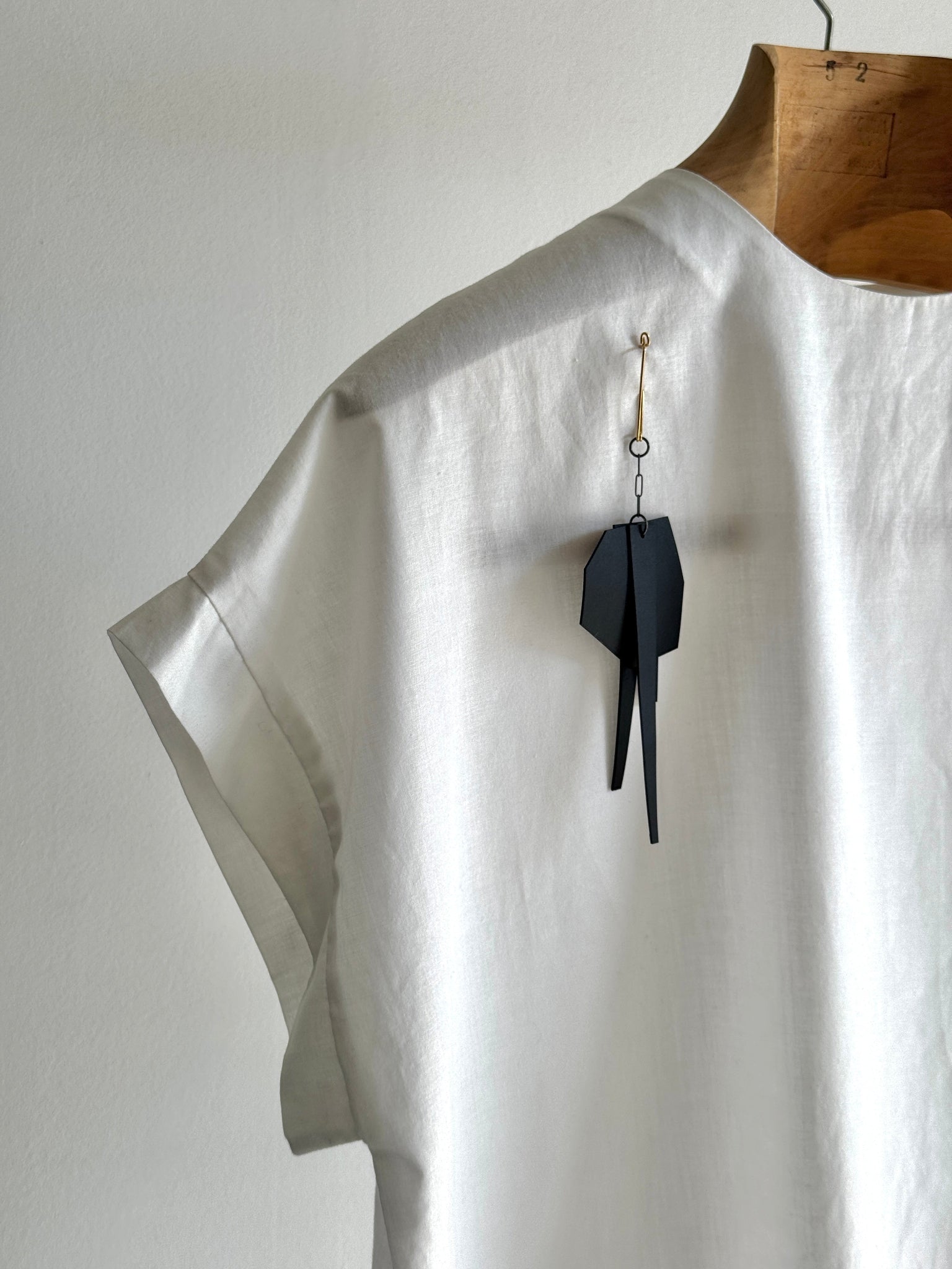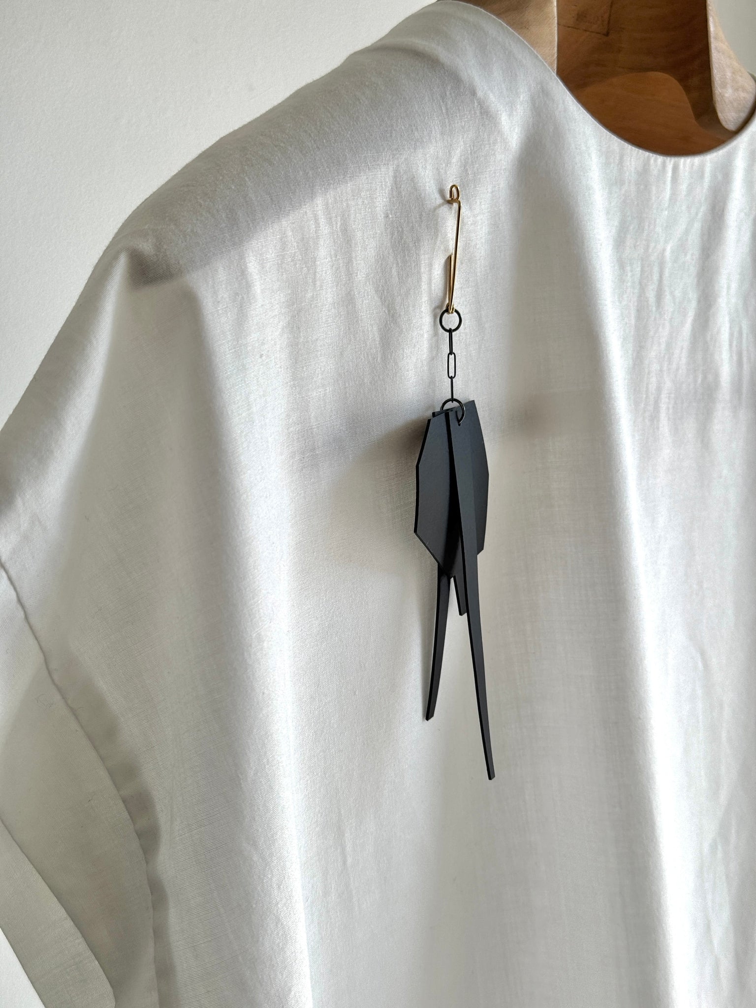 This collection's brooches transform classic jewelry archetypes into modern and edgy designs. Made of rubber geometric shapes, an oxidized silver chain, and a gold-plated pin, this brooch will make you stand out.