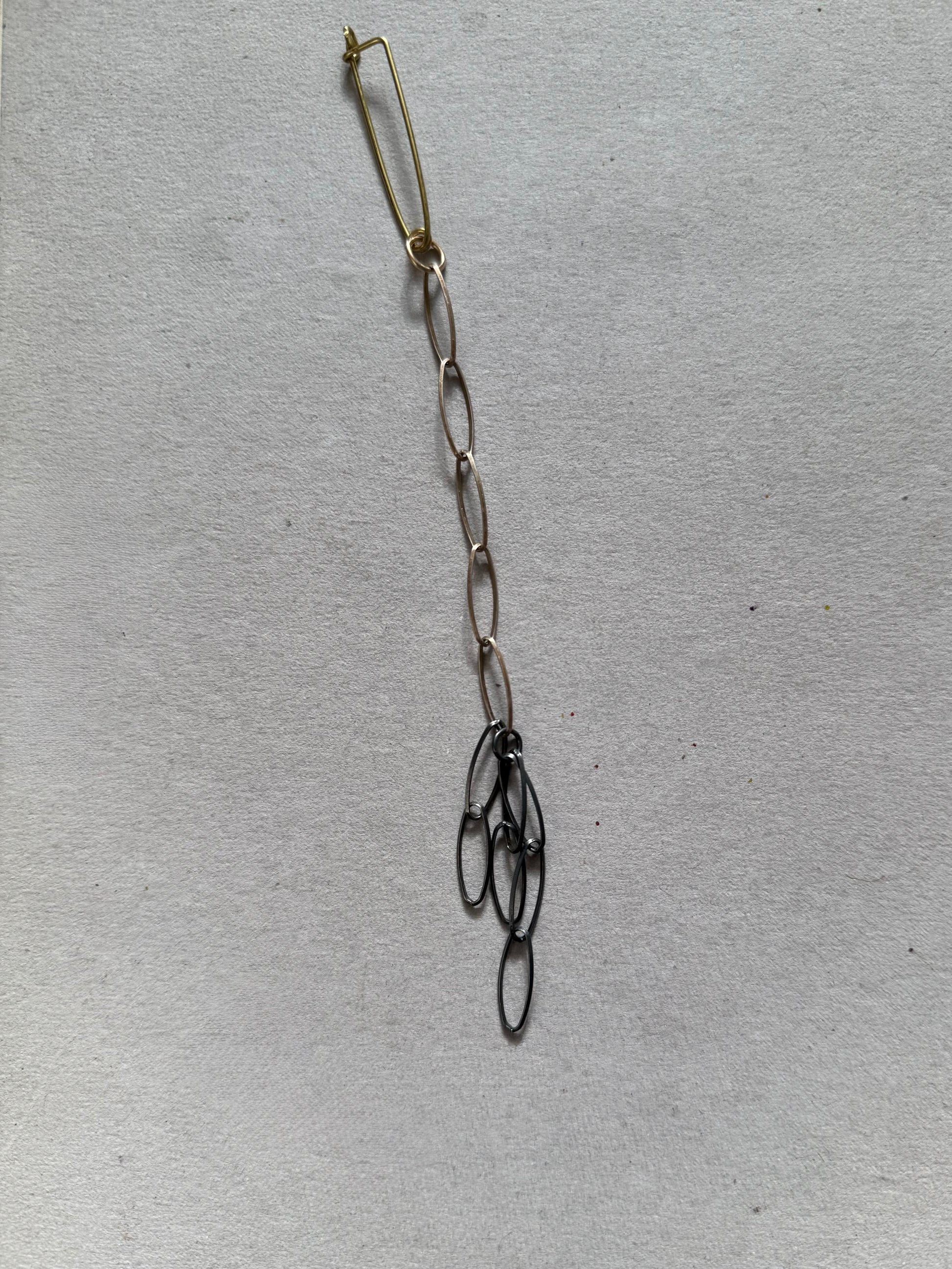 A variation on the traditional brooch. Made of an arrangement of silver and oxidized silver chain, this brooch will undoubtedly draw attention.