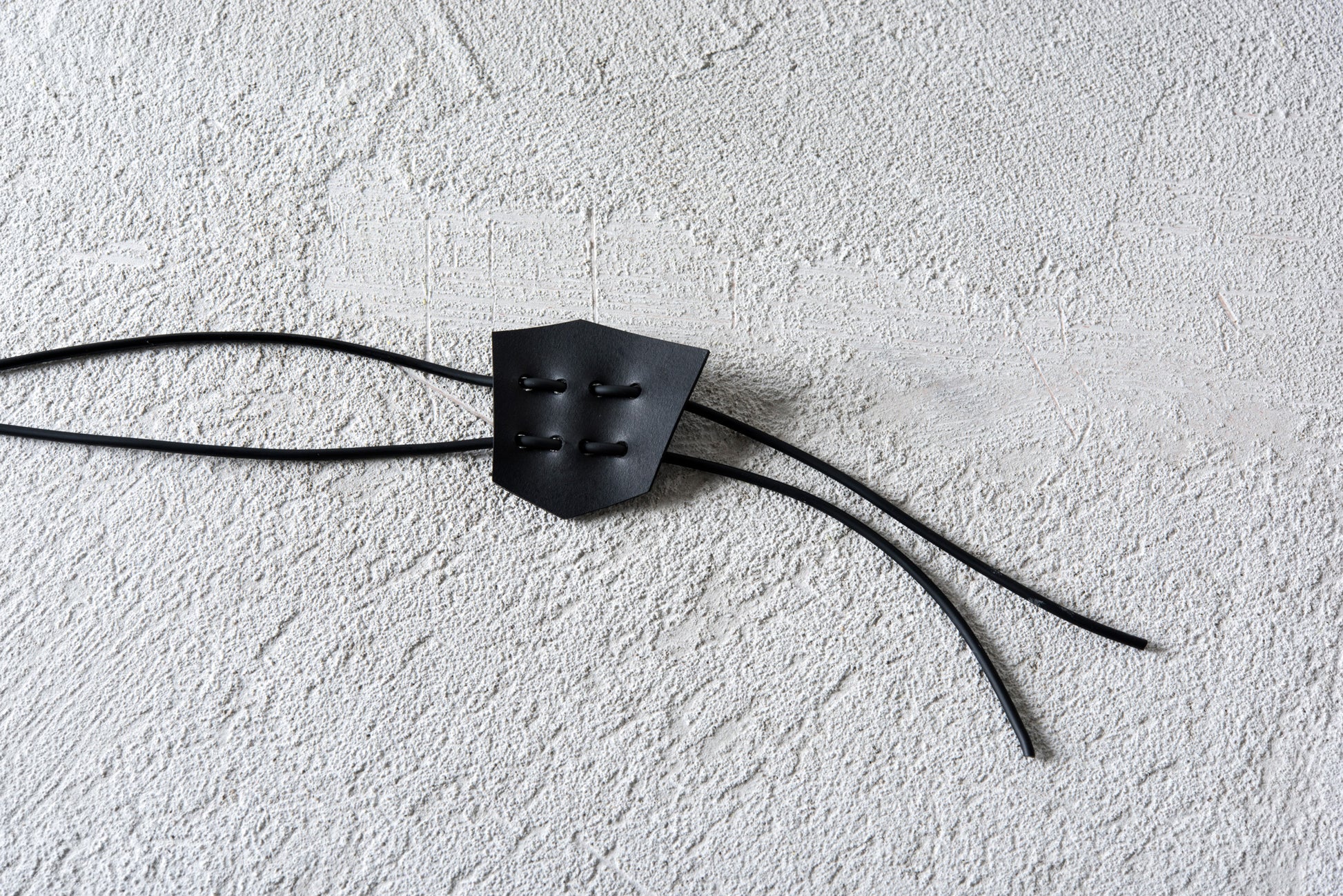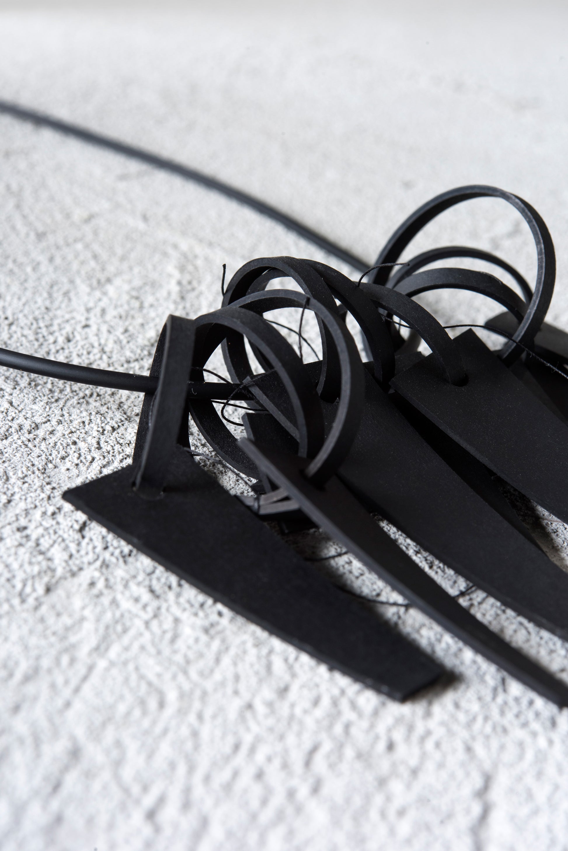 The necklace is a mix of different rubber shapes and has a bold look. Cotton threads add an airy and raw feeling to the solid structure of the rubber. The length of the necklace can be adjusted.