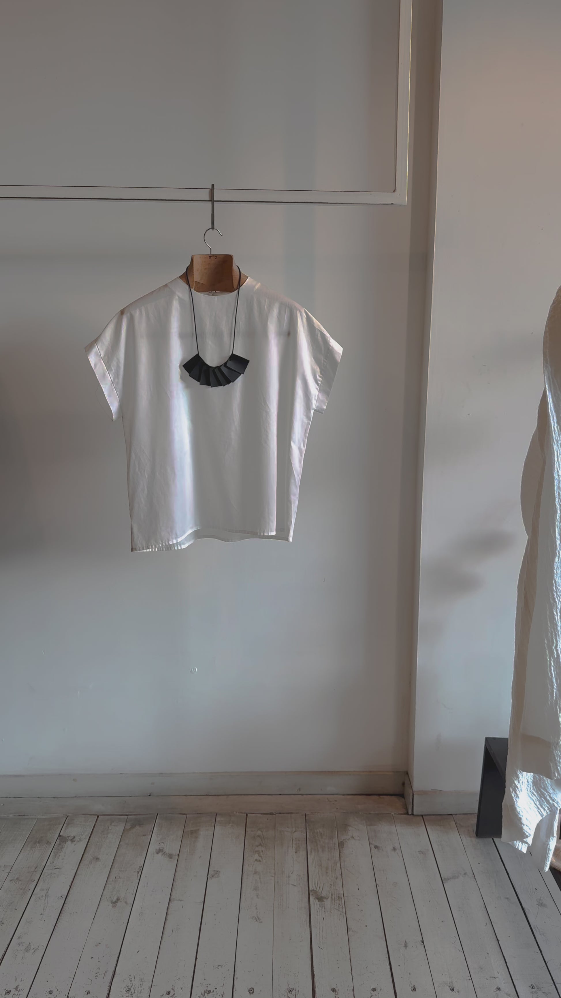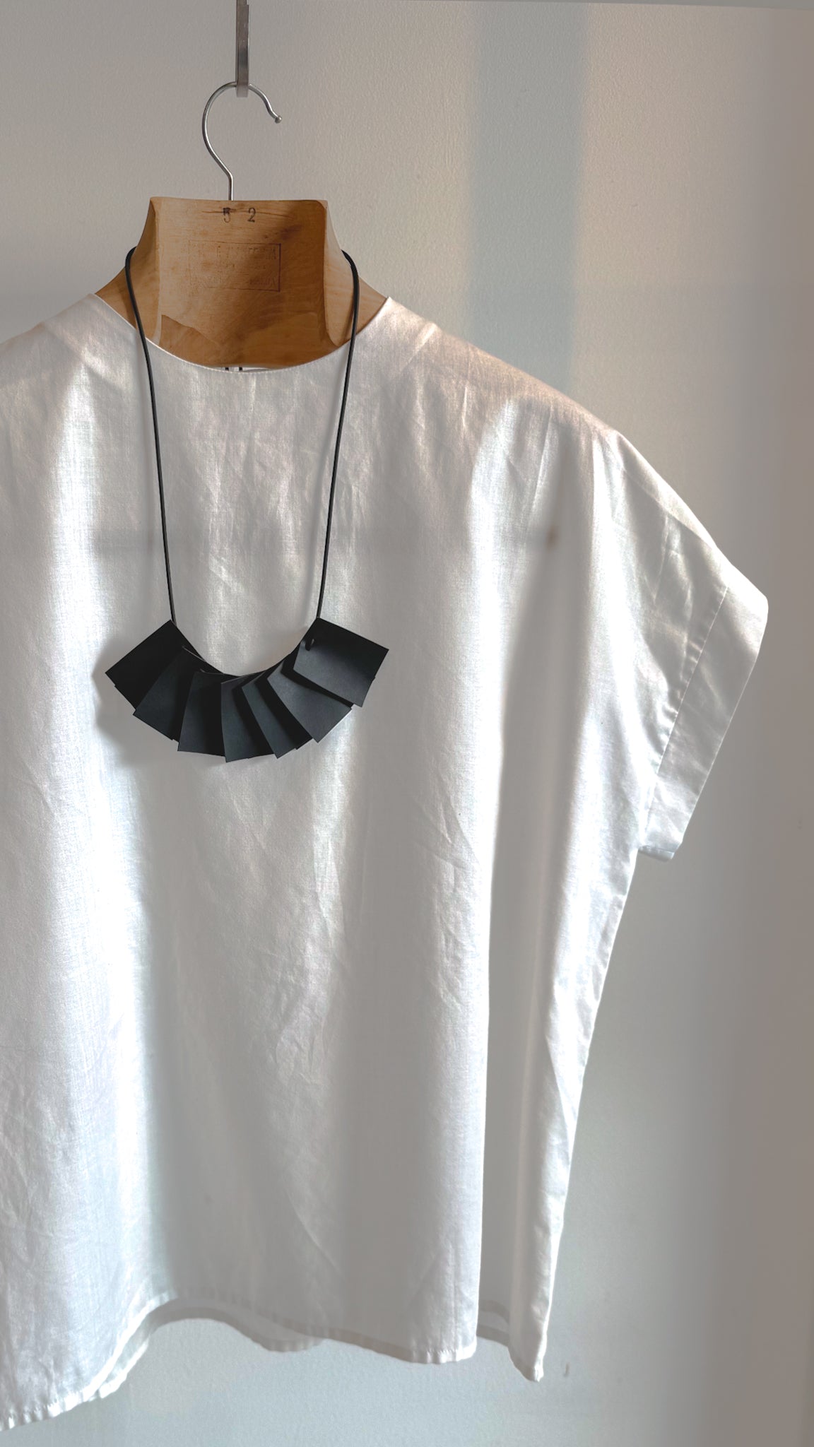 Plisse necklace resembles the structure and dynamics of the pleated fabric. It's made of rubber and has a geometric fan shape. A rubber clasp has been designed in a way that allows the length of the necklace to be adjusted.
