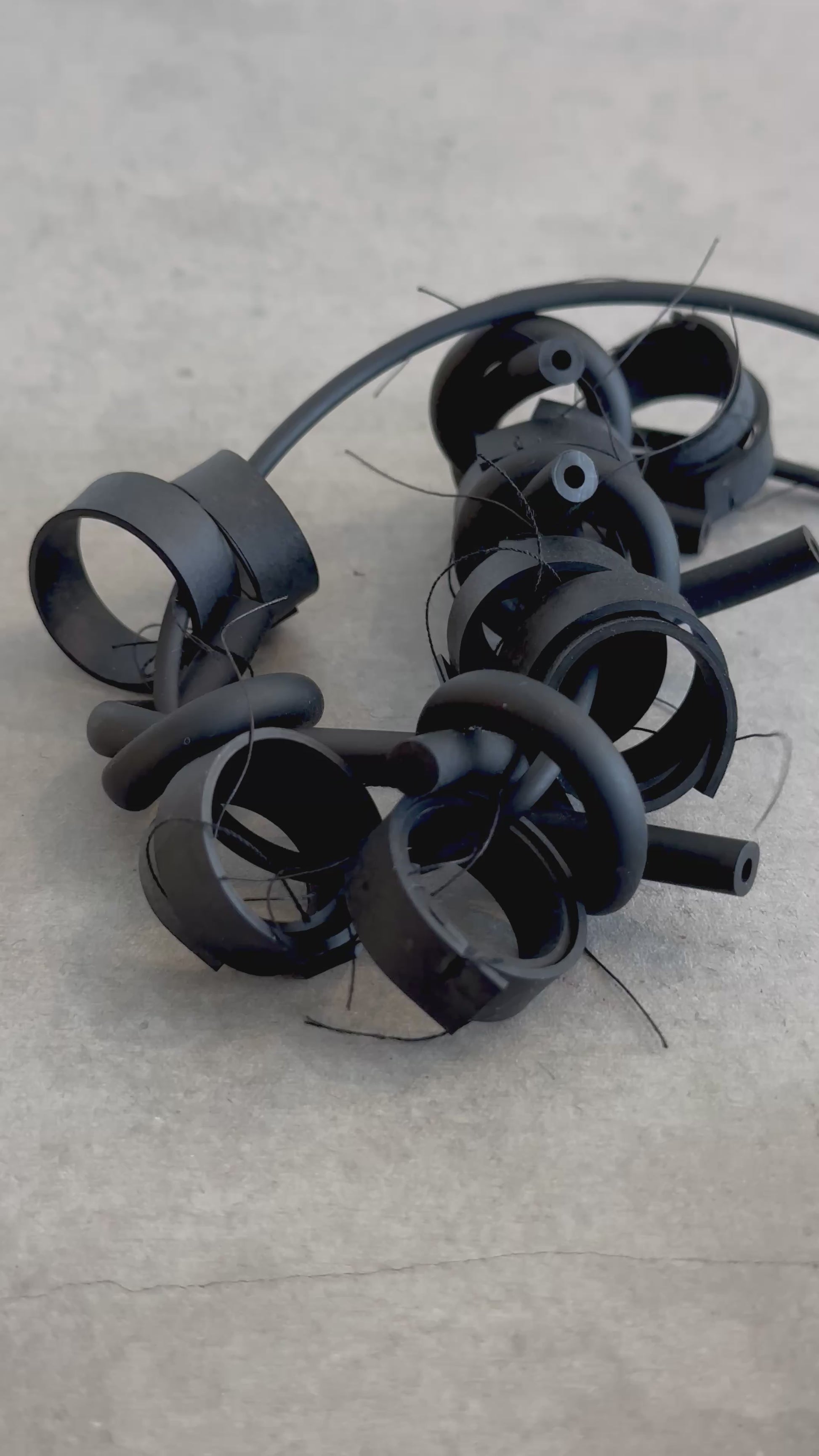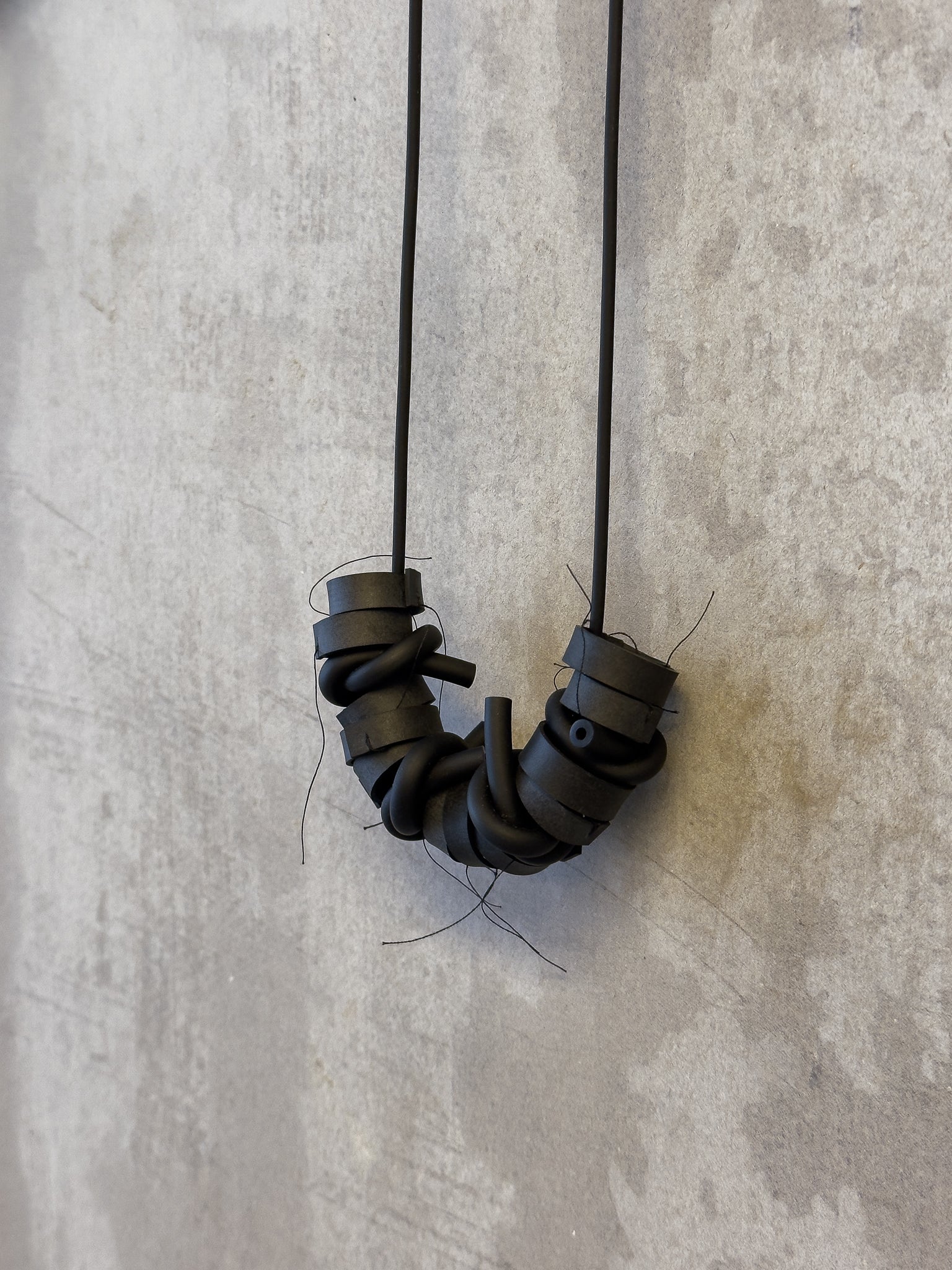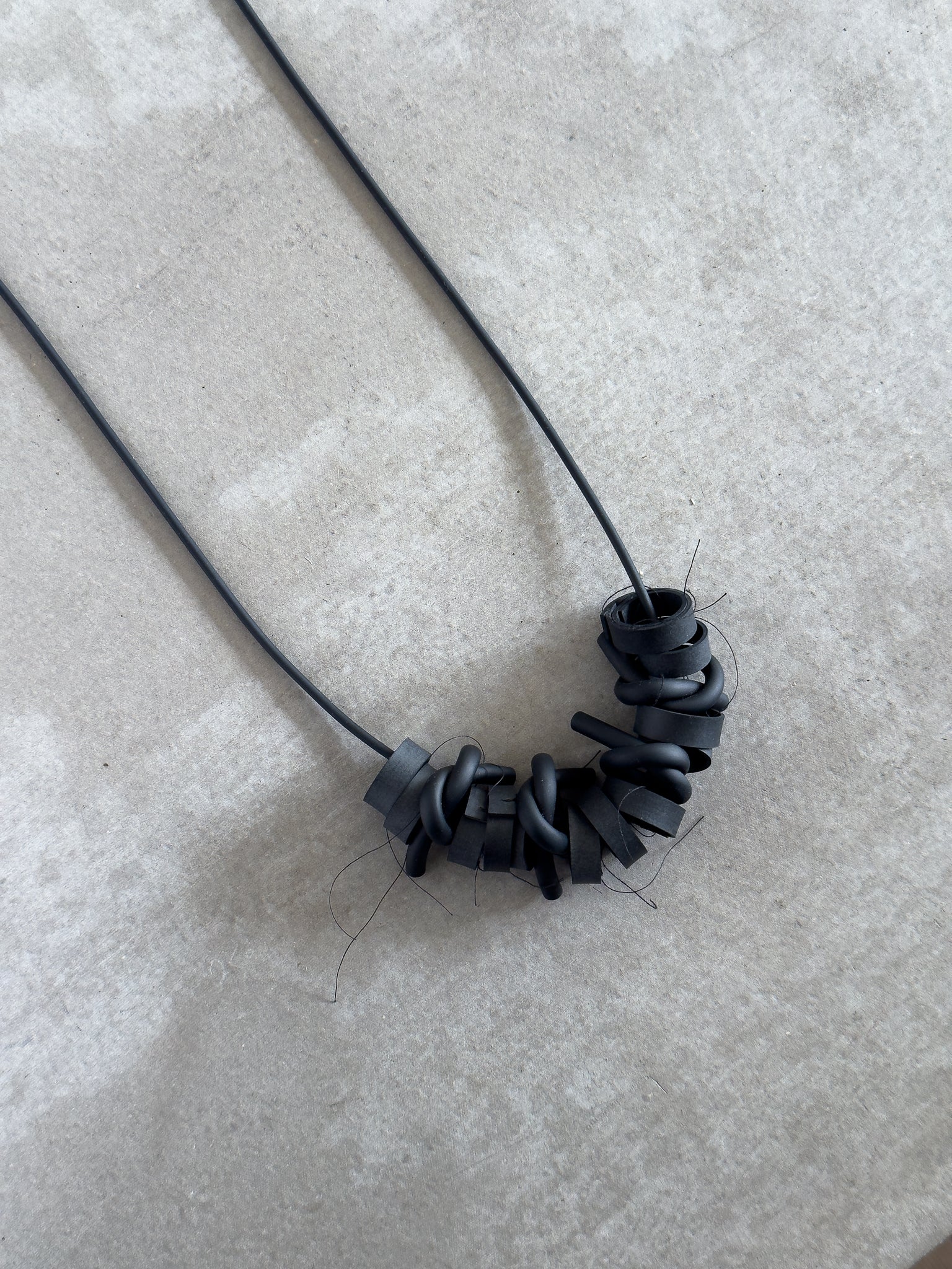 The knots necklace is made of rubber sheet and rubber cord. To make loops, a rubber sheet was cut into stripes and hand-sewed. The rubber cord is twisted to form knots.